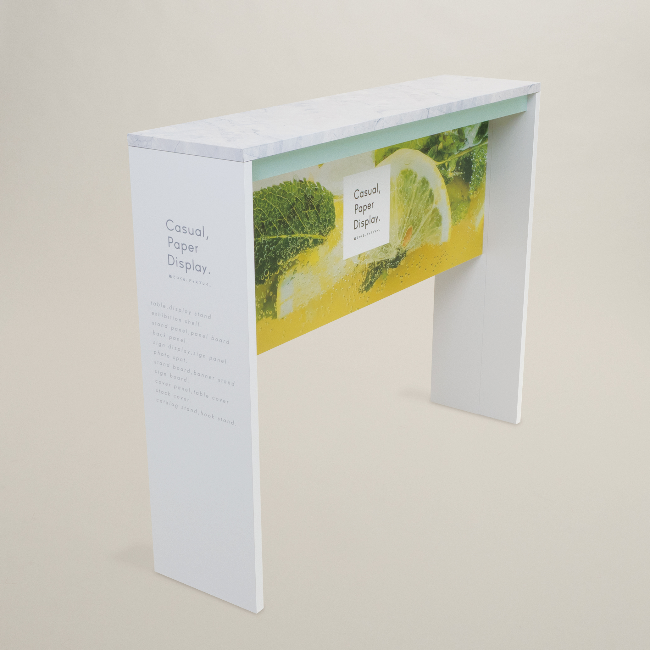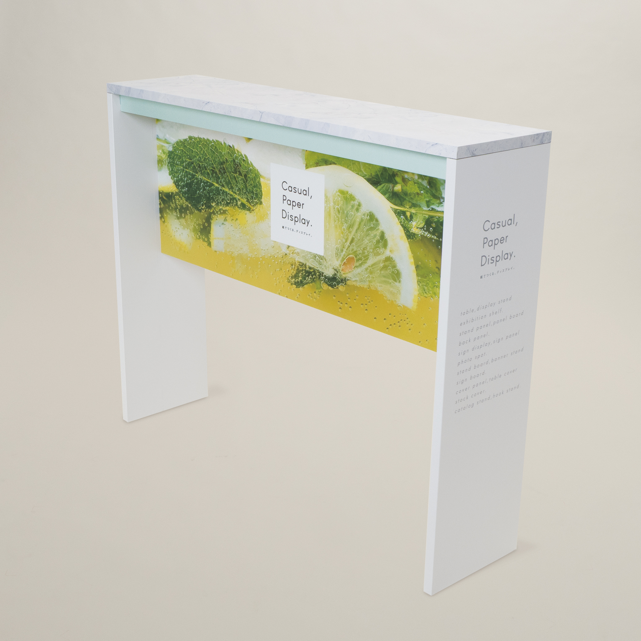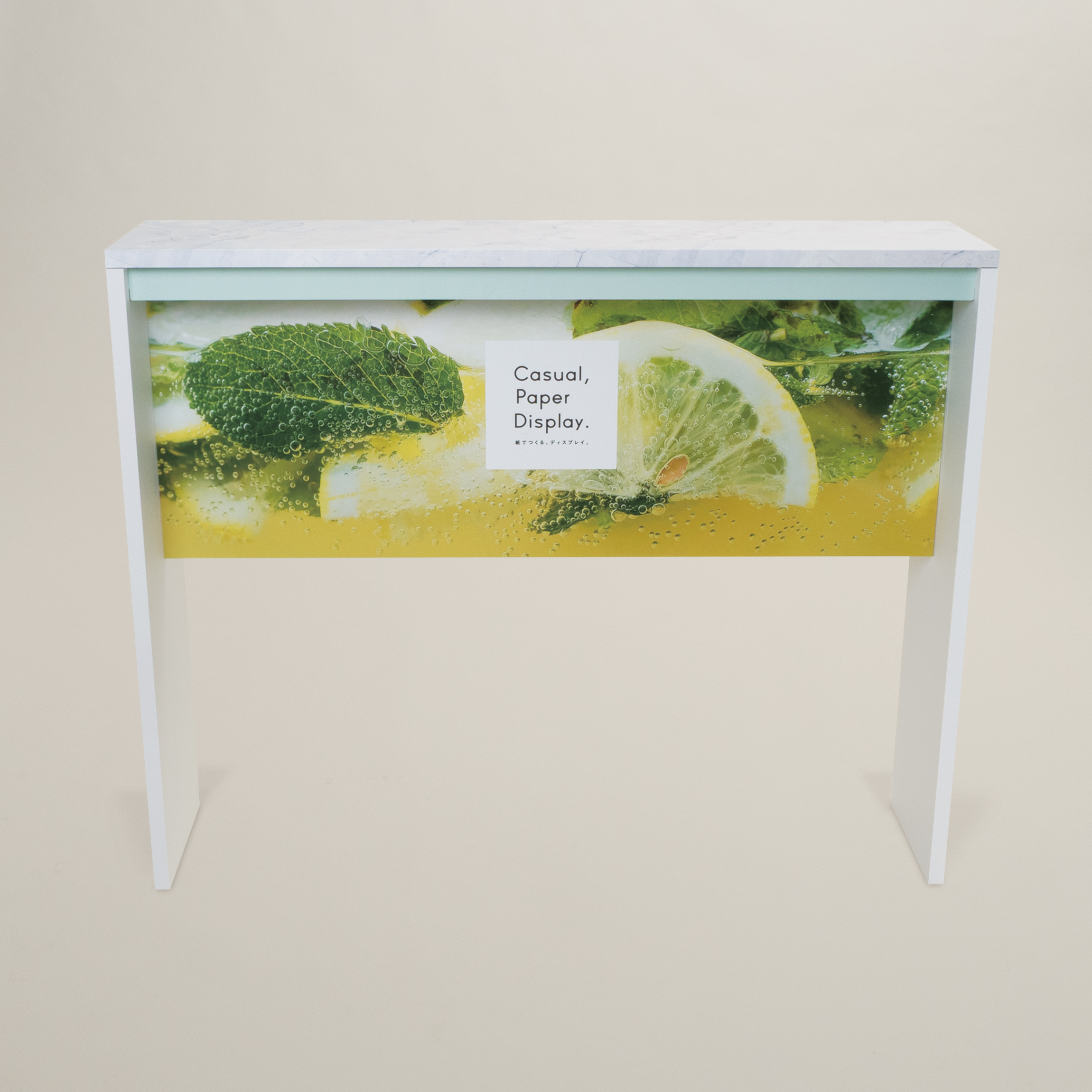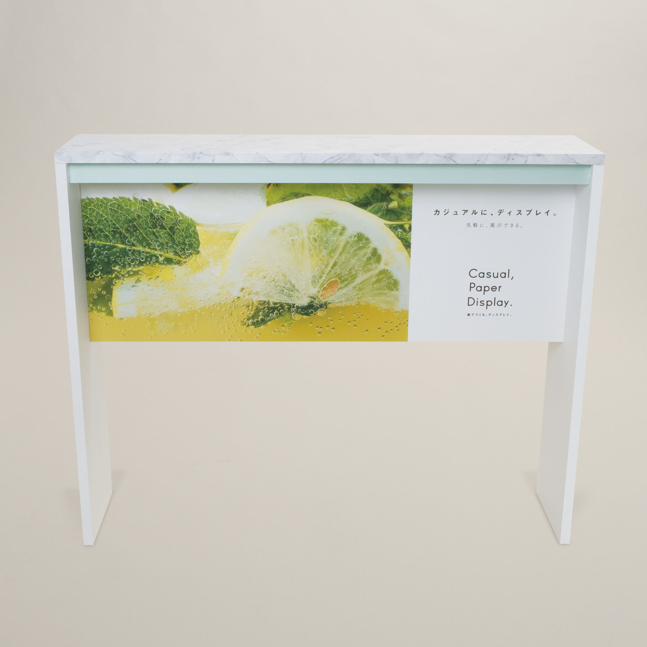 ハイカウンターテーブル(N) 製品番号 TB-23N 組立解体かんたん、 ハイカウンターテーブル。 通路などのスペースが限られた空間でも使用できる細身タイプの展示台です。 幅のある展示台となっており、小物などの展示などにご使用いただけます。 土台部分の幕板は、サインとして使用でき展示とともにPRも可能です。 スペック 関連シリーズ 本体寸法 約 W 1250mm × D 300mm × H 1000mm (通常) 箱寸法 約 1320mm × 528mm × 123mm (1台分) 重量 約 8.7kg (本体重量/標準サイズの場合) スペックPDFをダウンロード ハイカウンターテーブル 製品番号 TB-23 お問い合わせは こちら こちらもおすすめ カウンターテーブル(L) TB-14L 展示台(円柱、スリムタイプ) TB-04S キアロスクーロ(四角)_天面有 CHIAROSCURO CH4T,CH4N 展示台(キャプション付) TB-19 展示台(四角柱)/正面パネル付 TB-06FPN boldaについて Concept 製品の特徴 Product 素材の特徴 Material オーダーメイド Order Made